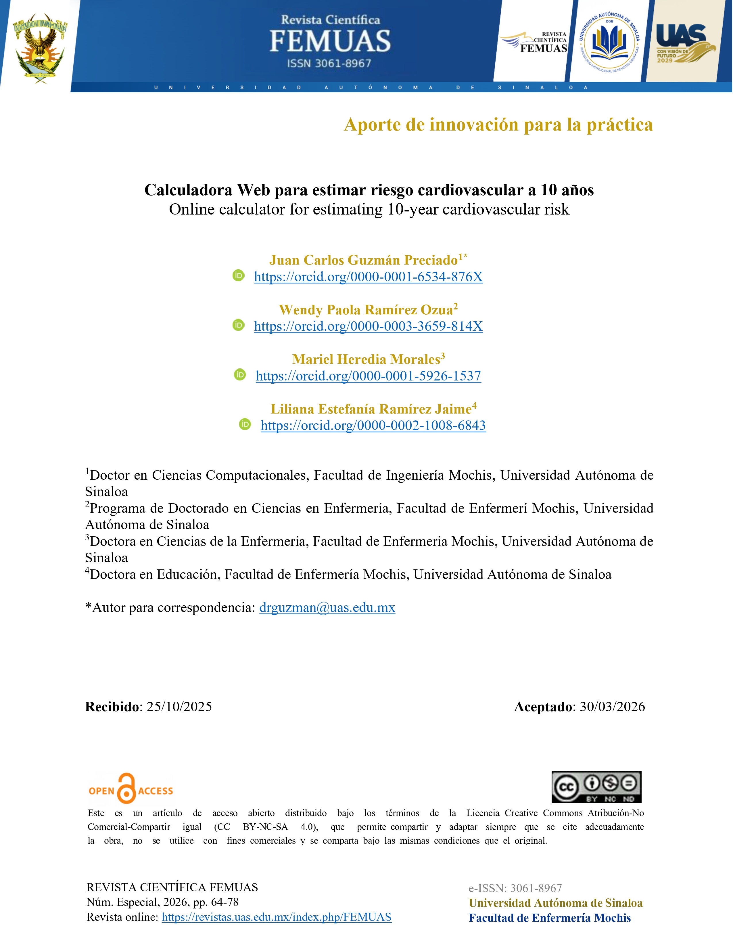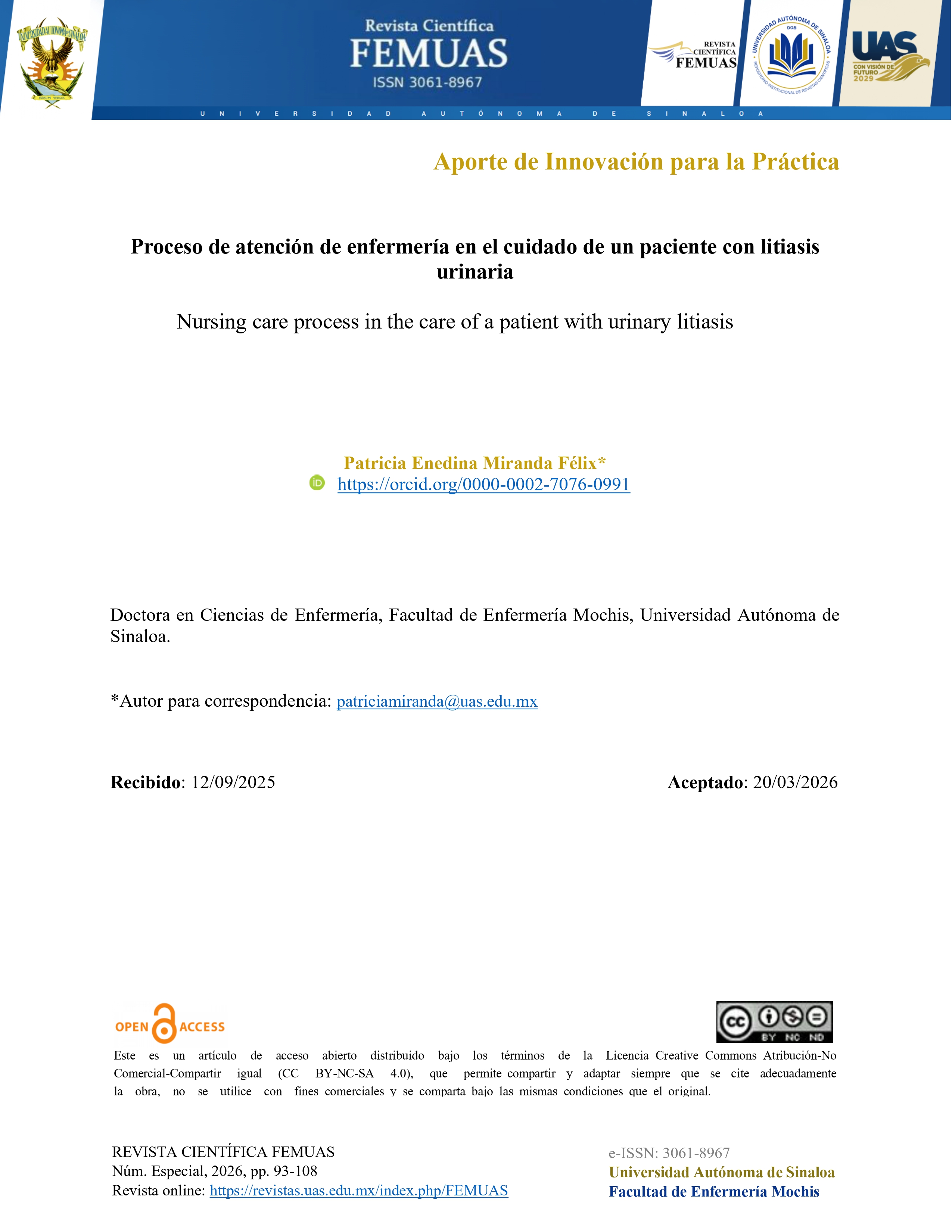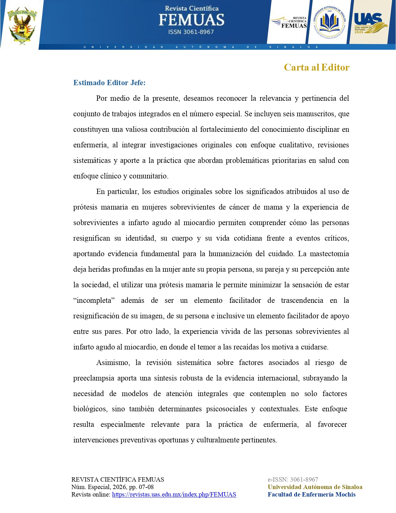 El presente Número Especial de la Revista Científica FEMUAS reúne seis artículos que integran investigaciones originales, revisiones sistemáticas y aportes innovadores para la práctica, abordando problemáticas prioritarias en salud. Esta edición destaca la importancia de comprender la experiencia del paciente, así como la aplicación de intervenciones basadas en evidencia. Asimismo, refleja el compromiso académico y colaborativo de investigadores a nivel nacional e internacional.
