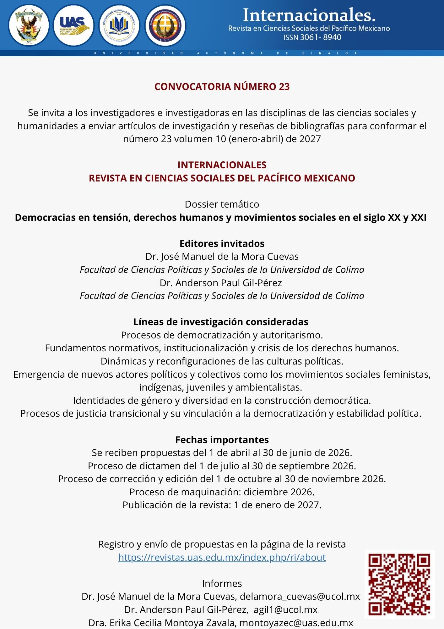 Internacionales. Revista en Ciencias Sociales del Pacífico Mexicano, es una publicación cuatrimestral editada por la Universidad Autónoma de Sinaloa a través de la Facultad de Estudios Internacionales y Políticas Públicas, Prol. Josefa Ortiz de Domínguez, s/n, Ciudad Universitaria, Culiacán, Sinaloa, C.P. 80040, Tel. (667) 712-7937, https://revistas.uas.edu.mx/index.php/RI/index Editor en jefe: Erika Cecilia Montoya Zavala. Reserva de Derechos al Uso Exclusivo No. 04- 2024-110712472800-102, ISSN: 3061-8940, ambos ante el Instituto Nacional del Derecho de Autor. Licitud de Título y Contenido No. 16501, otorgado por Revistas Ilustradas de la Secretaría de Gobernación.