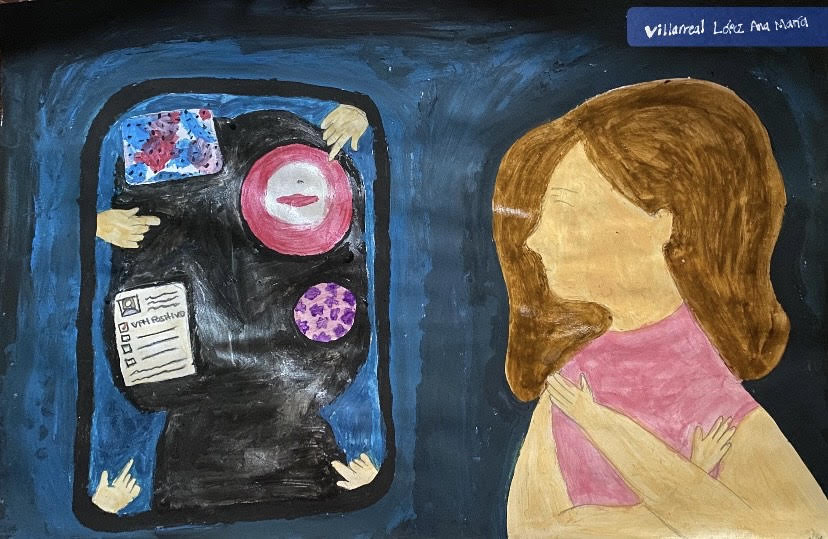 El fondo oscuro y las manos que apuntan dentro del espejo representan el estigma, el juicio social y el miedo al rechazo que muchas pacientes enfrentan. La mujer se abraza a sí misma, reflejando vulnerabilidad, pero también la necesidad de amor propio, de aceptación y esperanza, pues no todo está perdido después de recibir un diagnóstico.